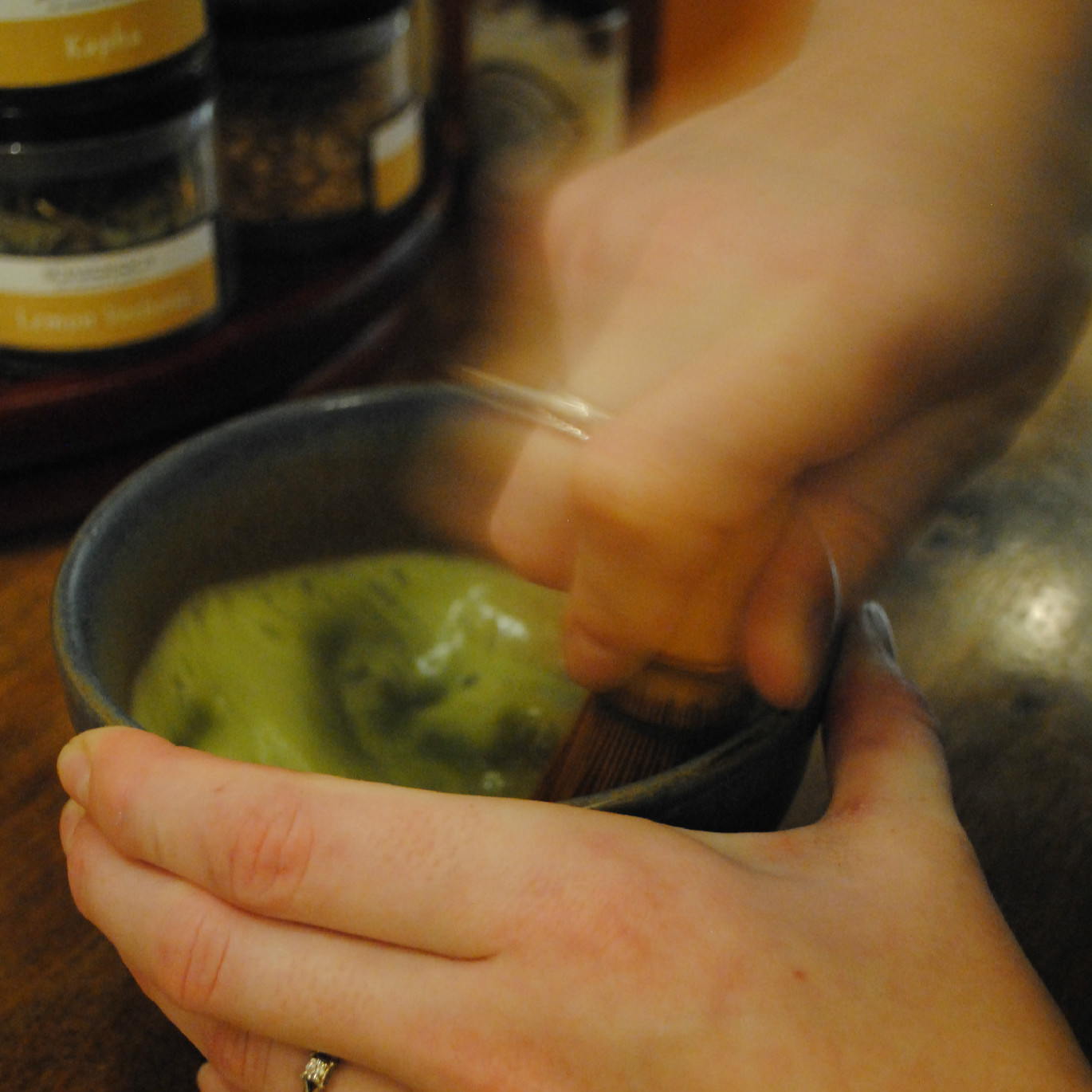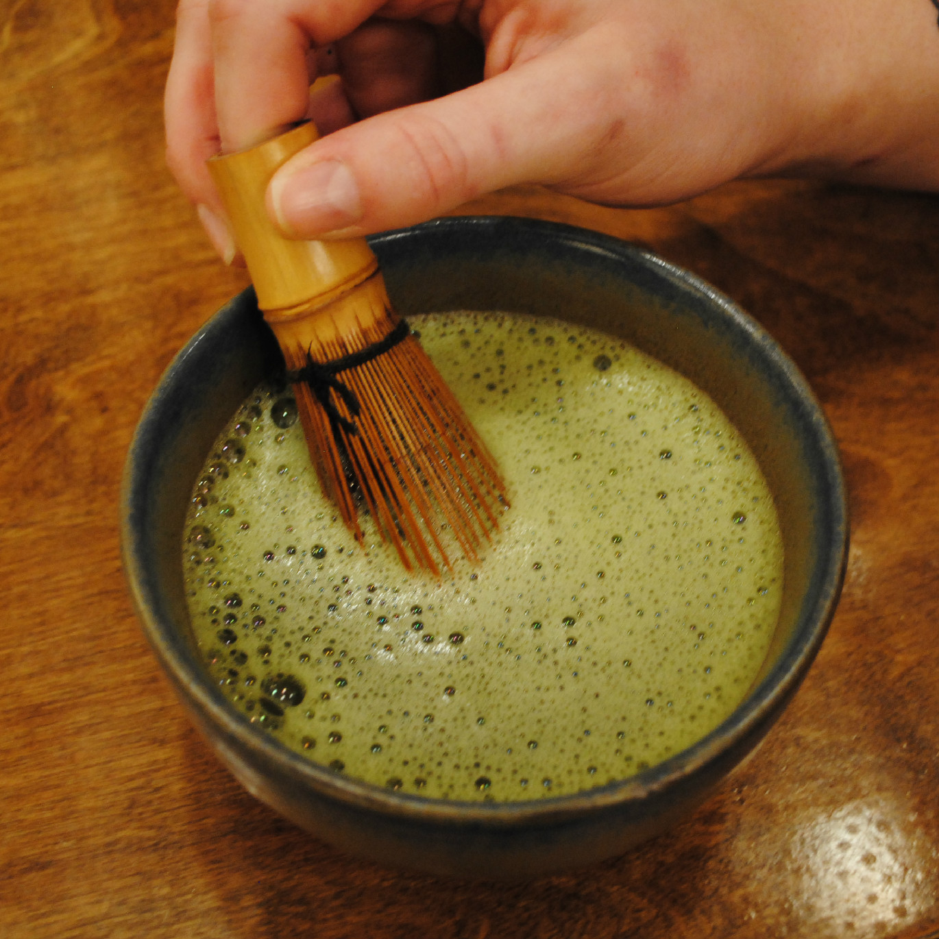 The powder is vigorously whisked together with hot water until the surface is light-green and frothy.